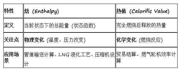 在热力学中,焓 (Enthalpy) 是一个描述系统能量状态的函数,通常用符号 H 表示。对于天然气这种流体,焓值代表了它所拥有的总能量。