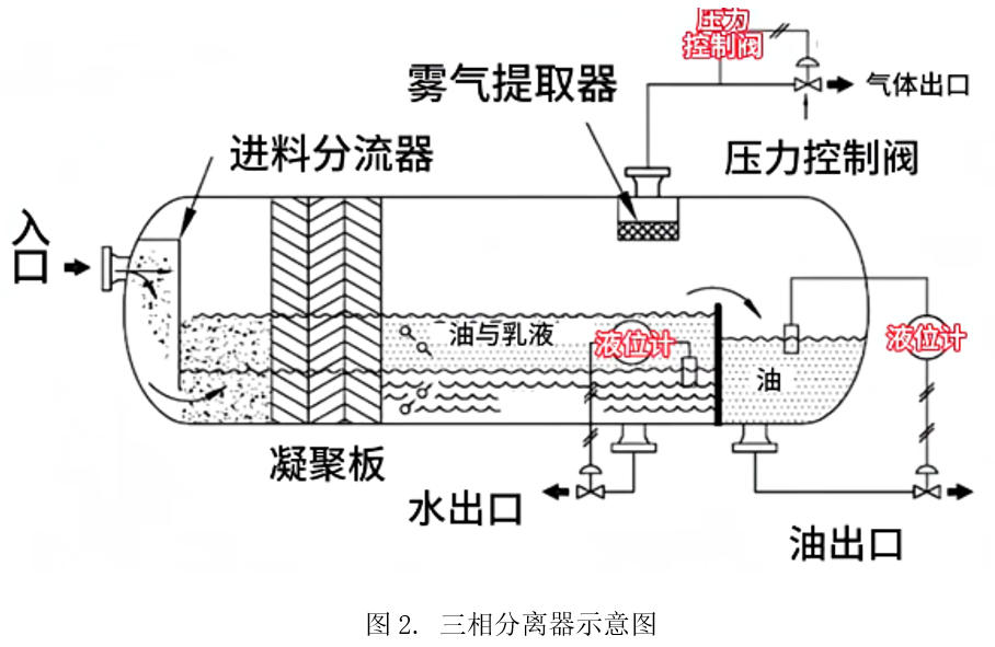 三相分离器是一种专门用于将油井流出的混合液体分离成三种成分——油、气、水的设备,如图2所。在油气开采中,井口流出的液体通常是油、气和水的混合物,这些成分在生产过程中需要分开,以便进行进一步的处理和利用。三相分离器通过物理分离原理,有效地分离这些成分,为油气生产提供重要支持。
